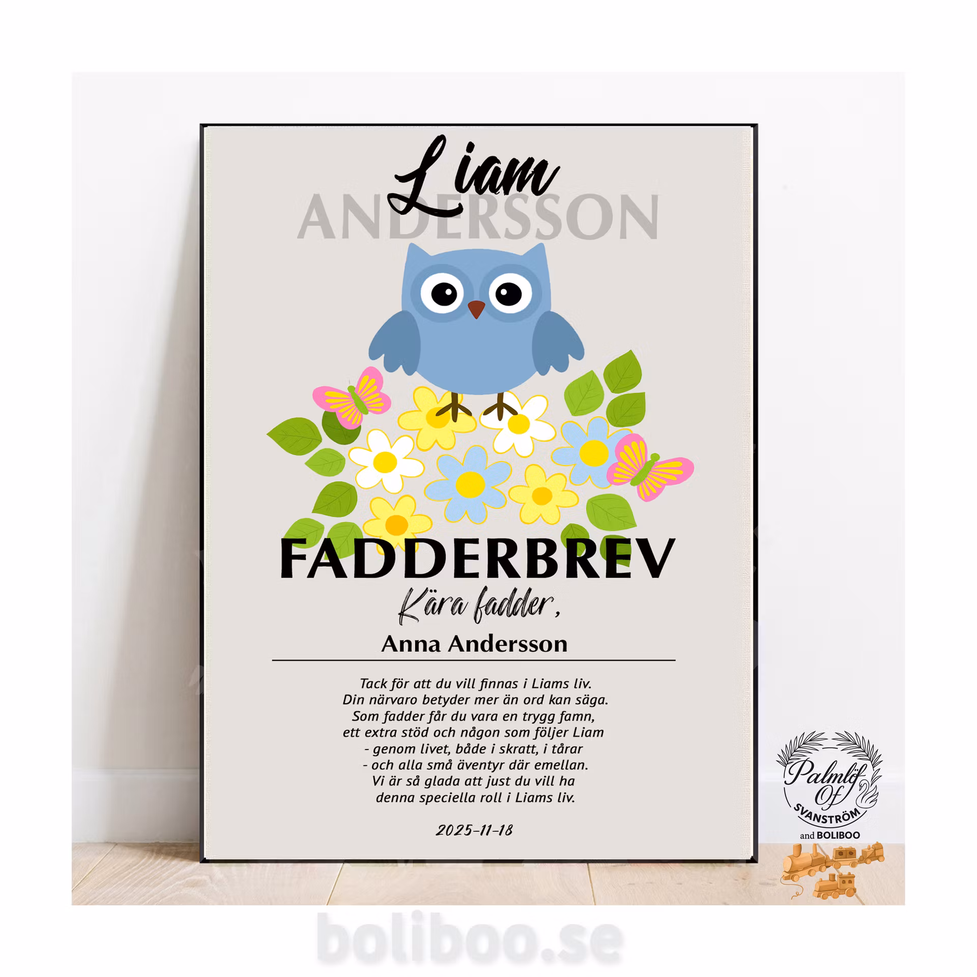 Fint fadderbrev till dop eller namngivning som är perfekt att ge bort till fadder/fadderbarn.