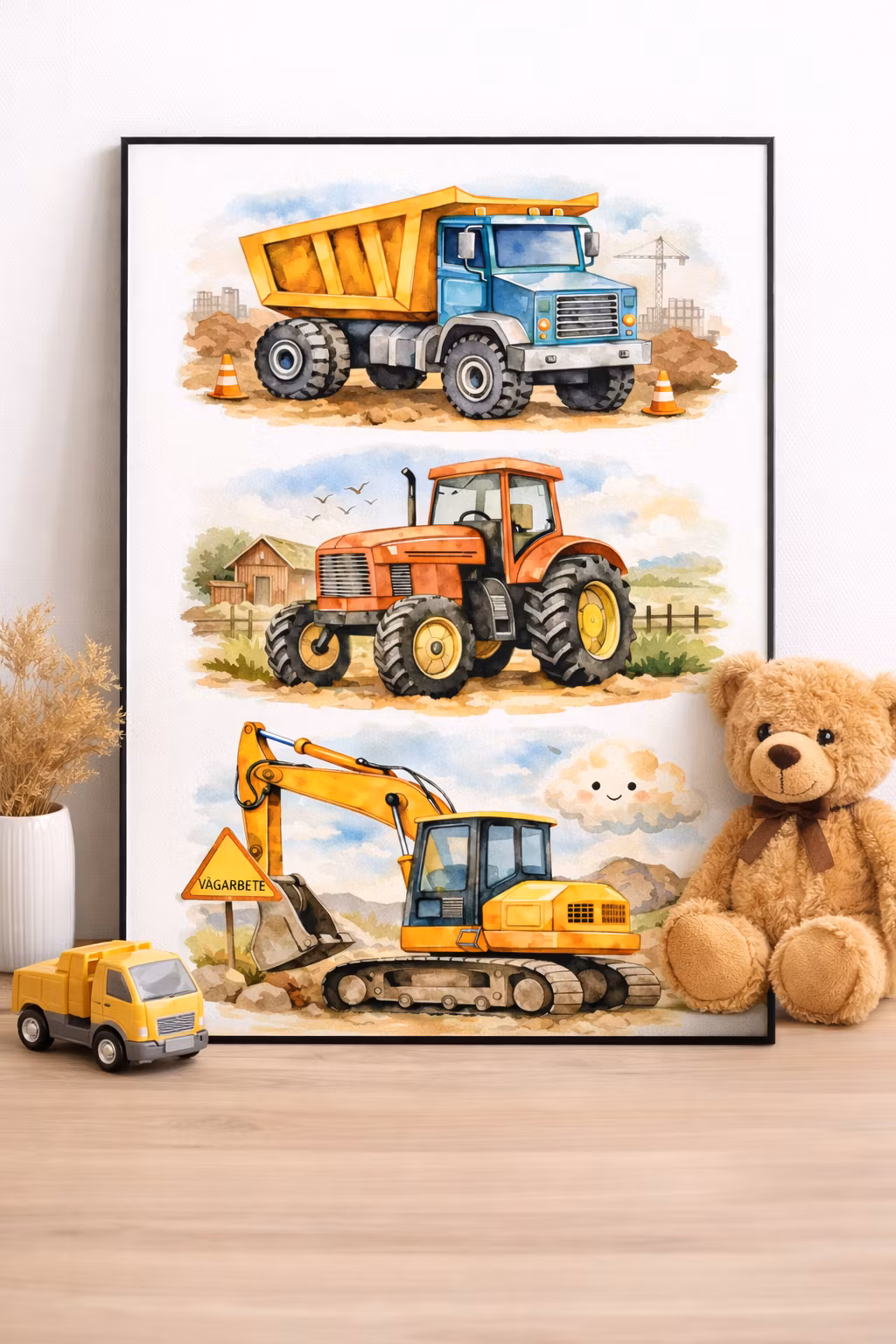 fordon, tavla, barnrum, posters, lastbil, grävmaskin, traktor