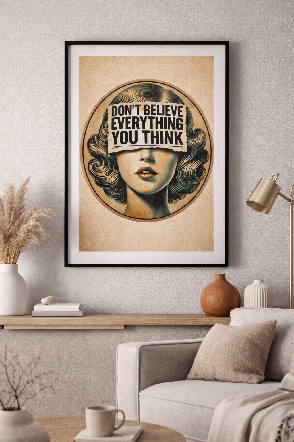 Don’t Believe Everything You Think – Stilren Vintage Citatposter. En tankeväckande och stilren poster som kombinerar modern design med vintage estetik.