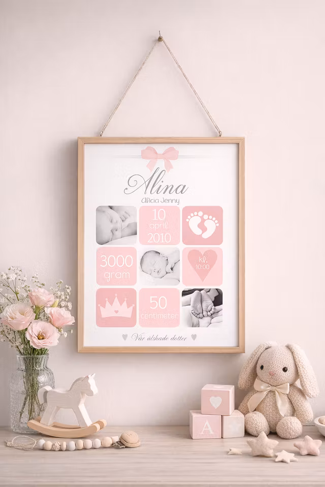 Med mjuka rosa toner, personliga bilder och noggrant utvalda detaljer blir denna tavla en vacker inredningsdetalj i barnrummet – och ett minne att bära med sig för alltid.