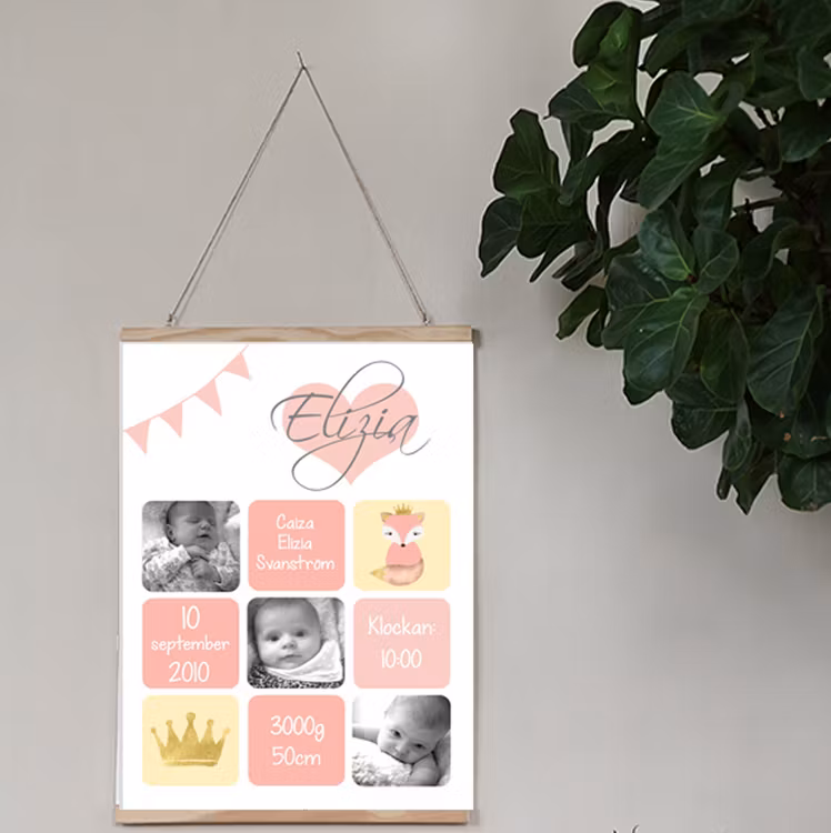 Namntavla, doptavla, födelseposter med barnets personliga uppgifter. Perfekt till dop, namngivning & present!