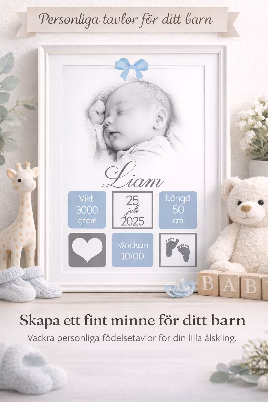 Födelseposter Underbar blå 99 kr Namntavla, doptavla, födelseposter med barnets personliga uppgifter. Perfekt till dop, namngivning & present! Storlek Födelseposter Underbar 21x30 cm Födelseposter Underbar 30x40 cm I lager Lägg i korgen Lagersaldo: Artikelnummer: 89 Leverantör: BOLIBOO Dela Information Namntavla, doptavla, födelseposter med barnets personliga uppgifter och foto.